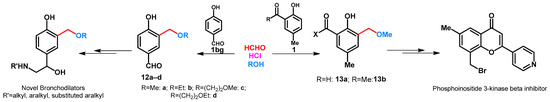 The synthesis of 4-hydroxy-3-alkoxymethylbenzaldehydes (12a-d) was reported by Hirose et al. The role of hydrochloric acid is to form 3-chloromethyl intermediate that reacts immediately with the alcohols applied in the reaction (Scheme 6) [34]. Methoxymethylation of 2-hydroxy-5-methylbenzaldehyde was published by Jorgensen et al. (Scheme 6) [35]. Compound 13a was then transformed to new potential fibroblast growth factor (FGF) receptor 1 kinase inhibitors. Methoxymethylation of 2-hydroxy-5-methylacetophenone was performed in methanol by using paraformaldehyde in the presence of cc. hydrochloric acid (Scheme 6) [36]. Ortho-situated hydroxyl and acetyl functions enabled the building of substituted pyran moiety.