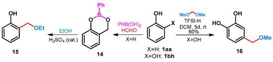 Ortho-selective ethoxymethylation was published by Bélanger et al. [37]. Phenol 1aa was reacted with formaldehyde in the presence of phenylboronic acid, leading to 1,3,2-benzodioxaborin 14 (Scheme 7). Treatment of 14 with ethanol in the presence of sulphuric acid catalyst gave the desired 2-ethoxymethylphenol 15. By treatment of 1,2-dihydroxybenzene (1bh) with dimethoxymethane in the presence of bistrifluoromethanesulfonimide (TFSI-H), a regioselective Friedel–Crafts alkylation took place and compound 16 was isolated in a yield of 60% (Scheme 7) [5].
