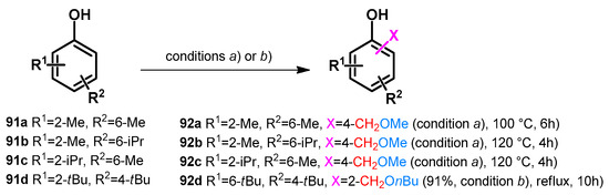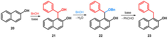 Regarding alkoxyalkylations of naphthol and its derivatives, the first synthesis concerns such compounds as hydroxylated/alkoxylated bisarylmethylene (BAM) intermediates. In this regard, the reaction of 2-naphthol and benzyl alcohol occurring under high temperature and in the presence of a base—due to which the benzyl alcohol is in situ oxidized to benzaldehyde—yields compound 21. Subsequently, 21 has been observed to react with the still present benzyl alcohol, yielding compound 22, which through a base-catalyzed elimination loses benzaldehyde, leaving behind the final benzyl-substituted product 23 (Scheme 8) [43].