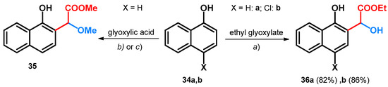 When starting out from ethyl glyoxylate and utilizing ytterbium(III) trifluoromethanesulfonate in DCM beside the previously described phenol derivatives (Scheme 10), 1-naphthol (34a) and its 4-chloro derivative (34b) gave hydroxyl derivatives (36a,b, Scheme 10) [40].