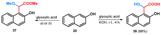 Without the use of such catalysts, applying only KOH, glyoxylic acid condenses with 20, yielding α-hydroxy-α-(2-hydroxy-1-naphthyl)acetic acid (38, Scheme 11). Unfortunately, the acquired enantiomers could not be resolved due to possible racemization under the resolving conditions [49].