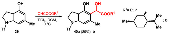 The previously mentioned glyoxylic acid esters have also been utilized on phenols fused with heterocycles. However, in the case of compound 39—despite the EDGs on the aromatic ring—titanium catalyst was needed most probably due to the strong inactivating effect of the triflate protecting group on the pyrrolidine moieties’ nitrogen. The reaction yielded the ethyl ester derivative 40a in high yield (89%); however, as far as we know there was no published yield for the relatively more interesting (–)–menthol ester (40b, Scheme 12) [50].