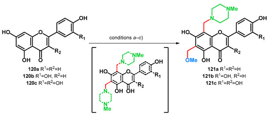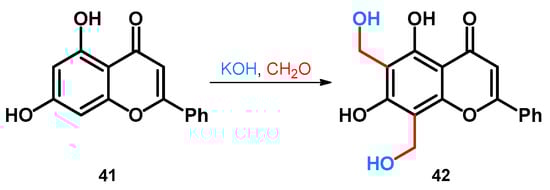 Regarding phenol-fused ring-systems, another interesting reaction concerns the transformation of chrysin, a naturally occurring flavonoid. The reaction conditions specified in the patent were not discoverable, but similar conditions are also discussed later, in the case of indole derivatives in Section 2.3.1.: the flavonoid (41) was reacted with a formaldehyde source in the presence of an alkali hydroxide that gave rise to the formation of the methoxymethylated derivative 42 (Scheme 13) [51].