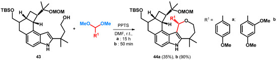 During the development of the total synthesis of penitrems—a family of tremorgenic mycotoxins isolated from Penicillium crustosum—researchers were looking for indole nitrogen protecting groups that would not reduce the reactivity of the indole substructure in a modified Mannich reaction. When trying to build in a methoxylated benzyl protecting group, starting out from the acetal of the corresponding aldehydes under acidic conditions with a free alcoholic group—conditions like what later was exploited as described in Section 2.2. Scheme 9—yielded alkoxyalkylated BAMs 44a,b (Scheme 14) [52].