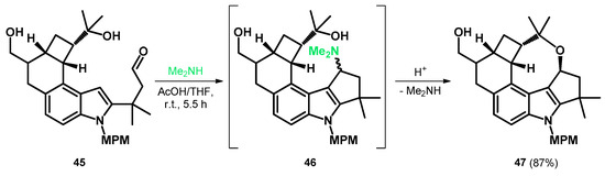 Later, MPM (p-methoxybenzyl) was found to be a sufficient protecting group and the N-protected aldehyde 45 was prepared to take part in the aforementioned modified Mannich reaction, yielding the alkoxyalkylated indole-fused oxocine 47 as the final product via intermediate Mannich-base 46 and a tandem Mannich cyclization/gramine fragmentation sequence (Scheme 15). Subsequently, compound 47 was further transformed to give the A–F rings of penitrems with appropriate functionalization [52].