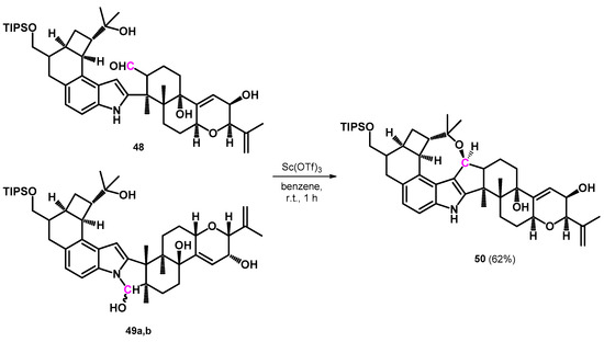 The same research group later described the complete total synthesis of the penitrem ring-systems utilizing a different reaction pathway. This reaction also required the building of the oxocine ring condensed—among other rings—on the indole substructure that required no Mannich-type intermediate. Alcohols 48 and 49a,b were synthesized and were tandem-cyclized into the oxocine-condensed ring-system (50) using scandium triflate (Scheme 16) [53].