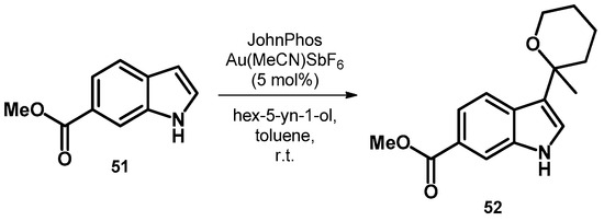 Starting out from less functionalized indole derivatives, the first publication describes the synthesis of a novel Nav1.7 sodium channel inhibitor discovery. Compound 52 was synthesized uniquely among the other derivatives described using a gold salt as oxidizer starting out from 51 (Scheme 17). Compound 52 was later transformed; however, the final product had no inhibitory effect [54].