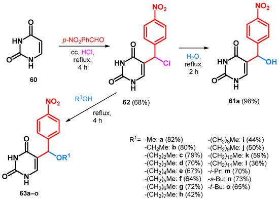 Building upon these transformations, Hlavác et al. described the synthesis of 61a in very similar reaction conditions. However, instead of the hydroxy derivative, first they obtained the chloro derivative (62) that had to be further hydrolyzed without the presence of hydrochloric acid. The scope and limitations was also investigated by supplementing water with different aliphatic alcohols, all yielding the alkoxymethylated BAMs incorporating the uracil moiety (63a–o, Scheme 18) [59].