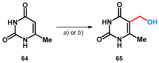 Besides aromatic aldehydes, paraformaldehyde was also investigated in the case of 6-methyluracil. The reaction was carried out using KOH as additive, and in both cases the final product was a hydroxymethylated derivative (65). However, it is interesting to mention the differences between the two publications: one describes no solvent and a much longer reaction (route a)) [60], while the other describes the solvent and, despite only a 5 °C difference, half the reaction time and much better yields (route b)) (Scheme 19) [61]. Both reactions share similarities with the incomplete transformation described in Scheme 13 [51].