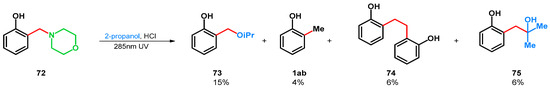 - Roth, H.J.; Michel, K. Bestrahlung von 2-Morpholinomethyl-phenol in Isopropanol 5. Mitt.: Zur Photochemie der 2-Aminomethyl-phenole. Arch. Pharm. 1971, 304, 493–498. [Google Scholar] [CrossRef] [PubMed]