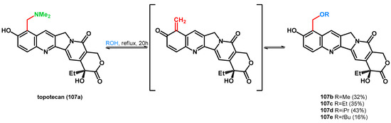 - Tan, H.; Wang, G.; Li, J.; Meng, G.; Liu, Z.; Dong, M.; Li, Y.; Ju, D.; Zhang, Q. Synthesis of Novel 10-Hydroxycamptothecin Derivatives Utilizing Topotecan Hydrochloride as Ortho-Quinonemethide Precursor. Bioorg. Med. Chem. 2015, 23, 118–125. [Google Scholar] [CrossRef]
