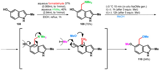 - Monti, S.A.; Johnson, W.O. Position Selective Mannich Reactions of Some 5- and 6-Hydroxyindoles. Tetrahedron 1970, 26, 3685–3694. [Google Scholar] [CrossRef]