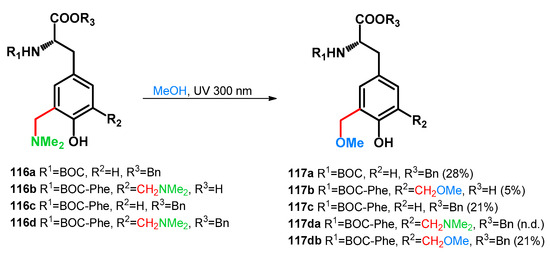 - Husak, A.; Noichl, B.P.; Šumanovac Ramljak, T.; Sohora, M.; Škalamera, Đ.; Budiša, N.; Basarić, N. Photochemical Formation of Quinone Methides from Peptides Containing Modified Tyrosine. Org. Biomol. Chem. 2016, 14, 10894–10905. [Google Scholar] [CrossRef] [PubMed]