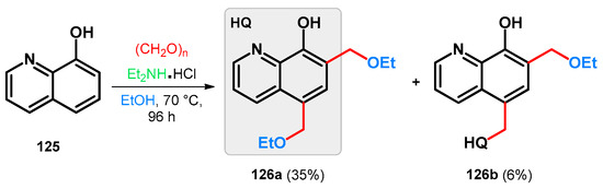 - Csuvik, O.; Szatmári, I. Synthesis of Bioactive Aminomethylated 8-Hydroxyquinolines via the Modified Mannich Reaction. Int. J. Mol. Sci. 2023, 24, 7915. [Google Scholar] [CrossRef] [PubMed]