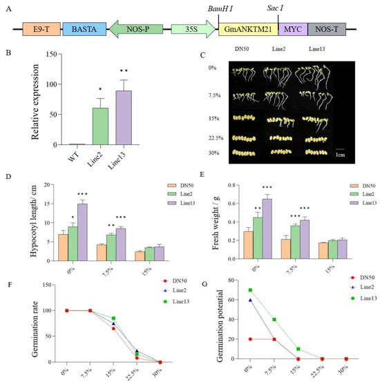 2.2. The Overexpression of GmANKTM21 Enhanced the Tolerance of Soybeans to Drought during Germination