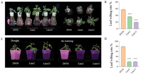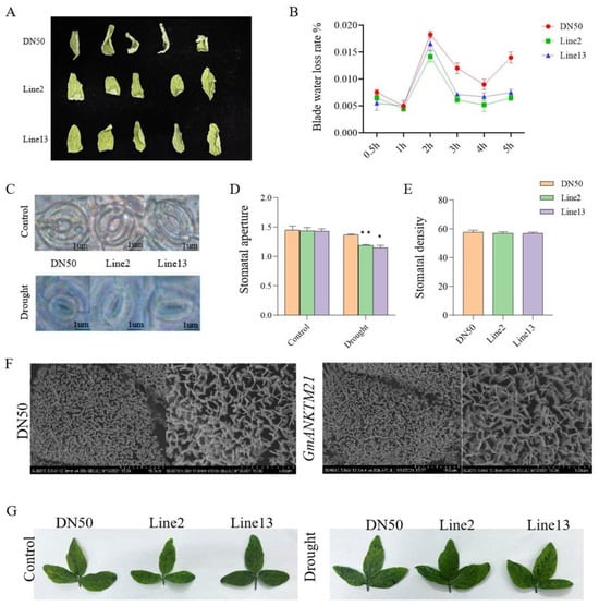 2.4. Overexpression of the GmANKTM21 Gene Enhanced the Water Retention Ability of Soybean