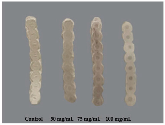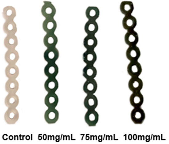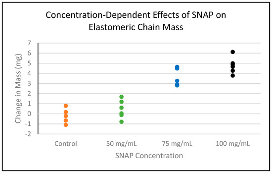 SNAP was successfully incorporated into existing clear elastomeric ligatures at three concentrations. All experimental and control samples returned to the same dimensions after drying and experimental chains exhibited a light-to-dark gradient of green color from lowest to highest concentration, respectively (Figure 1). The masses of ligatures were measured prior to and following impregnation (Table 1). The Spearman correlation coefficient was calculated to evaluate the strength of the relationship between the concentration of added SNAP and the change in chain mass. The coefficient was found to be 0.88 (p < 0.001), indicating a strong positive correlation between the two variables (Figure 2). The controls exhibited no increase in mass. In part 1 of this study, conducted by Warden et al., chains soaked in concentrations of 125 and 200 mg/mL SNAP/THF broke under tensile stress [59]. Ligatures incubated in 75 mg/mL solution as well as control chains maintained their elastic properties; therefore, in this experiment, all remaining procedures were carried out using the 75 mg/mL SNAP/THF samples.