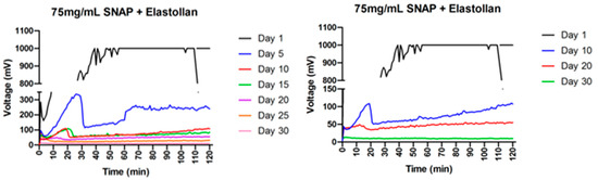 The experimental ligature (75 mg/mL SNAP/THF + Elastollan®) exhibited a large burst of NO release followed by a sharp decrease and then steady-state NO flux at 2 h on each day of testing with the NOA (Figure 4). On the first day of testing, the chain exhibited NO released above the reading capability of the machine and maintained this reading. This flux gradually decreased for twenty-nine days until showing no NO release over baseline on the thirtieth day of testing.