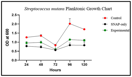 Growth curves in solutions containing experimental samples or SNAP-only ligatures vs. control exhibited markedly lower growth by 24 h and inhibition was maintained for 120 h (Figure 5). On average, at 24 h, vials containing experimental chains experienced a 24.39% decrease in planktonic growth compared to control chains. At 120 h, vials containing experimental ligatures experienced a 35.56% decrease compared to controls.
