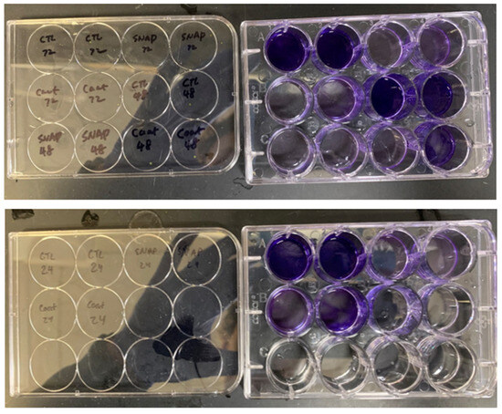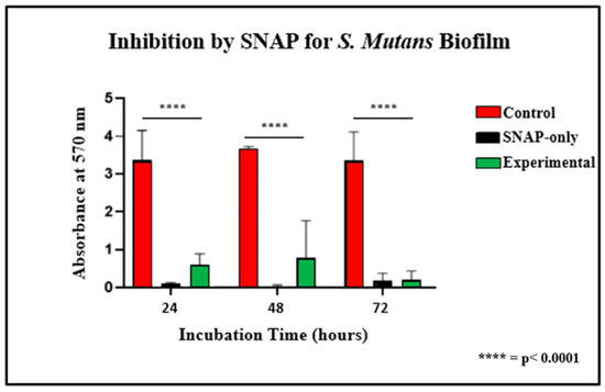 After plating 12-well plates with S. mutans biofilm and staining with crystal violet, wells containing experimental samples or SNAP-only chains exhibited a notable reduction in biofilm formation compared to controls (Figure 6). Statistical analysis revealed a significant decrease in biofilm formation on the well surface for both experimental and SNAP-only chains at 24, 48, and 72 h (p < 0.0001) (Figure 7). Additionally, there was no statistically significant difference in biofilm formation on the wells’ surfaces between those containing a coated experimental chain and those containing a SNAP-only chain. This indicates that the additional coating did not interfere with the bactericidal activity.