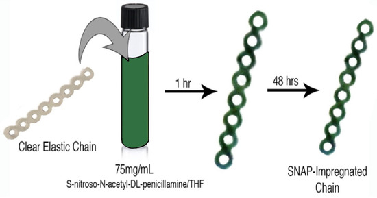 In the first part of this research, carried out by Warden et al., orthodontic elastomeric chains (6 loops, 17 mm long) were treated with 75 mg of SNAP using the swell–encapsulation–shrink method [59]. Initially, three solutions with concentrations of 75, 125, and 200 mg/mL were developed, along with controls. However, once washed and dried, only the ligatures soaked in the 75 mg/mL SNAP solution, as well as the controls, maintained their elastic properties. Therefore, the study continued using only the 75 mg/mL SNAP chains. Following successful impregnation of the SNAP, NO flux was measured daily for 2 h/day for 4 days to determine the duration and magnitude of NO release. The samples demonstrated nitric oxide release for three days and showed no release over baseline on the fourth day [59]. The experimental chains in Warden’s study also demonstrated a good level of efficacy in defending against the oral pathogen S. mutans [59]. Biofilm formation on surfaces adjacent to the ligatures and planktonic growth in solution were both significantly decreased with experimental chains compared to controls (p < 0.05) [59]. While the chains demonstrated bactericidal effects and nitric oxide release, it is important to note that most common orthodontic practices replace patients’ elastomeric ligatures every 4–6 weeks [60]. Therefore, for this application to become more relevant in clinical settings, the NO-release period should be further extended. Orthodontic elastomeric chains demonstrating NO release for several weeks to a month may be more appropriate. Sustained nitric oxide release can be achieved in two ways: (1) by interfering with the factors initiating the NO release from SNAP and (2) by introducing a barrier to prevent NO from escaping. Since SNAP’s nitric oxide-donating capabilities are driven by light, it can be inferred that limiting the amount of light contacting the SNAP-impregnated chain may result in less expulsion of NO [56].