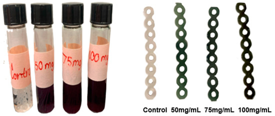S-nitroso-acetylpenicillamine (Pharmablock, Shanghai, China) was incorporated into an existing clear elastomeric ligature (8 loops, 23 mm long; J-120 Closed Clear Energy Chain, Rocky Mountain Orthodontics, Denver, CO, USA) using a swell–encapsulation–shrink method (Figure 8). SNAP was dissolved in 5 mL glass vials containing 4 mL tetrahydrofuran (THF) (Sigma-Aldrich, St. Louis, MO, USA) to produce three solutions at concentrations of 50, 75, and 100 mg/mL, respectively. Control vials contained 4 mL THF without SNAP. Both experimental and control ligatures were immersed in these solutions for 1 h, then removed, washed with PBS buffer (Fisher Scientific, Waltham, MA, USA), and left to dry in darkness for 48 h within a fume hood. Successful impregnation was visually confirmed by observing the characteristic green color of SNAP (Figure 9). The masses of the samples were measured before and after impregnation. The Spearman correlation coefficient was then calculated to assess the strength of the relationship between the concentration of added SNAP and the change in chain mass. Subsequently, elastomeric chains were stored in dark, dry aluminum foil wrappings.