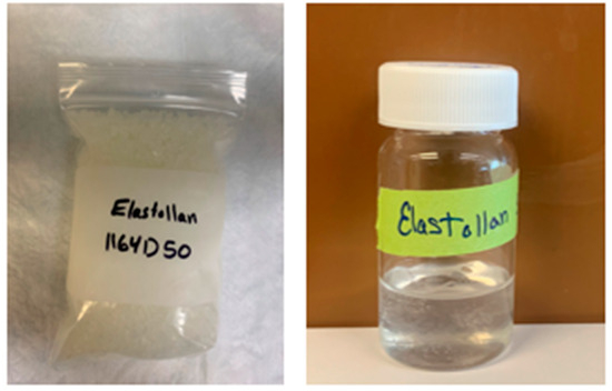 Elastollan® polymer pellets (left) and final polymer solution (right).