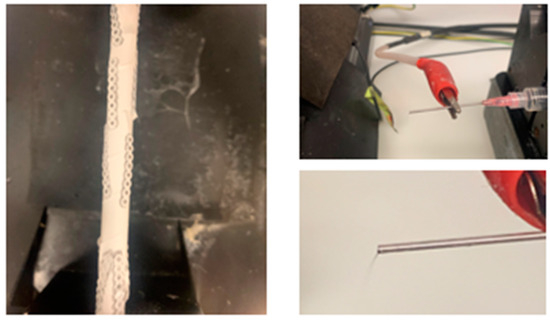 Photographs of the chains on the rotating rod (left) and polymer threads dispensing from the syringe (right).
