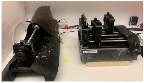 On the day of spinning, 6 mL of polymer solution was transferred to a plastic syringe with needle attached (Becton Dickinson, Franklin Lakes, NJ, USA). The syringe was emptied of all air bubbles and attached firmly to an automatic dispenser (Figure 11). Experimental ligatures were adhered to a mandrel located 15 cm from the syringe needle tip (Figure 12). The flow rate of the dispenser was set to 6 mL/h. and mandrel set to 300 rpm. The electrospinning was completed under an electric field of 20 kV. After 30 min, the electrospinning process was paused, allowing the chains to dry until flipped. They then ran for an additional 30 min coating the other side. The ligatures were dried and removed. All electrospinning was completed in the dark.