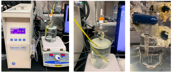 Sievers Chemiluminescence Nitric Oxide Analyzer (left), NO-release measurement configuration (middle), and chains suspended in PBS (right).