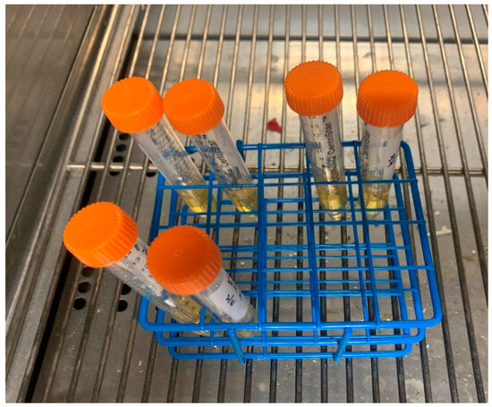 Via electrospinning, experimental ligatures (75 mg/mL SNAP/THF) were coated with an additional Elastollan® (BASF, Ludwigshafen, Germany) polymer matrix. This concentration was chosen to remain consistent with Warden et al.’s study [59]. Given the opportunity, samples of 50 mg/mL and 100 mg/mL were coated and tested, as well. A polymer solution of Elastollan® was produced by weighing out 10% w/v% polymer (100 mg Elastollan® in 1 mL solvent) dissolved in THF:DMF 1:1 v:v (Figure 10; Sigma-Aldrich, St. Louis, MO, USA). The solution was incubated at 37 °C overnight.