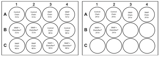 In a 12-well plate, a standardized solution of S. mutans was added to a 1 mL solution of BHI supplemented with 2% sucrose. The ratio of Inoculant to media was 1:30. Experimental, SNAP-only, and control chains (1 chain/well) were suspended in the solution and incubated at 37 °C, aerobically, for periods of 24, 48, and 72 h (Figure 15). All samples were removed, wells were washed with 2 mL PBS, and 500 µL 0.1% crystal violet stain (0.3% stock; Becton Dickinson, Franklin Lakes, NJ, USA) was added to each well. Following incubation for 30 min, wells were washed again with water and allowed to dry. Then, 1 mL 30% acetic acid (MilliporeSigma, Burlington, MA, USA) was added to each well to dissolve the crystal violet, and absorbance was measured at 570 nm. All tests were performed in duplicate.