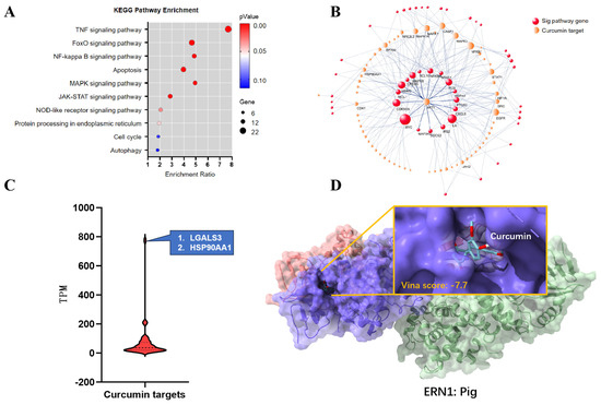 Cross−talk between CUR Targets with DON−induced Cytotoxicity Factors. (A) Top 10 enriched KEGG pathways for up−regulated. (B) Protein−protein interaction (PPI) network of curcumin target and genes on the top 8 up−regulated pathway significantly (p < 0.05) enriched KEGG pathways (only the nodes with connectivity greater than five are labelled on the network). (C) Violin plot for TPM distribution of 66 curcumin targets. (D) Molecular docking (Autodock result of the complex structures) showing the interaction of curcumin and porcine ERN1.