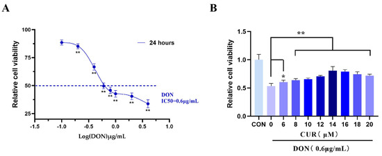 Evaluation of the Efficacy of CUR in Alleviating Cytotoxicity of IPEC−J2 Induced by DON. (A) The relative cell viability of IPEC−J2 cells exposed to DON for 24 h. (B) The relative cell viability of IPEC−J2 cells exposed to DON (0.6 μg/mL) combined with CUR for 24 h. * p < 0.05, ** p < 0.01, compared to 0.6 μg/mL DON + 0 μM CUR.