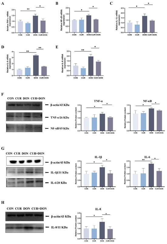 Verification of CUR on the Inhibition of TNF-α/NF-κB Signaling Pathways Induced by DON (A) Relative TNF-α mRNA level. (B) Relative NF-κB mRNA level. (C) Relative IL-1β mRNA level. (D) Relative IL-6 mRNA level. (E) Relative IL-8 mRNA level. (F) Relative protein levels of TNF-α and NF-κB. (G) Relative protein levels of IL-1β and IL-6. (H) Relative protein levels of IL-8. * p < 0.05, ** p < 0.01, compared to control (CON) and deoxynivalenol (DON).