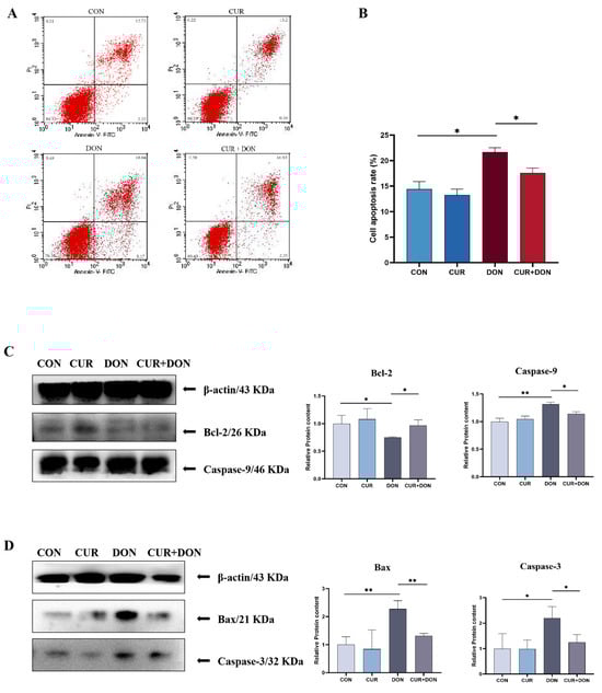 CUR Treatment Rescues the Apoptosis of IPEC-J2 Cells Induced by DON. (A) Cell death was assessed by annexin V/PI staining. (B) Cell apoptosis rate. (C) Relative protein levels of Caspase-9 and Bcl-2. (D) Relative protein levels of Bax and Caspase-3. * p < 0.05, ** p < 0.01, compared to control (CON) and deoxynivalenol (DON).