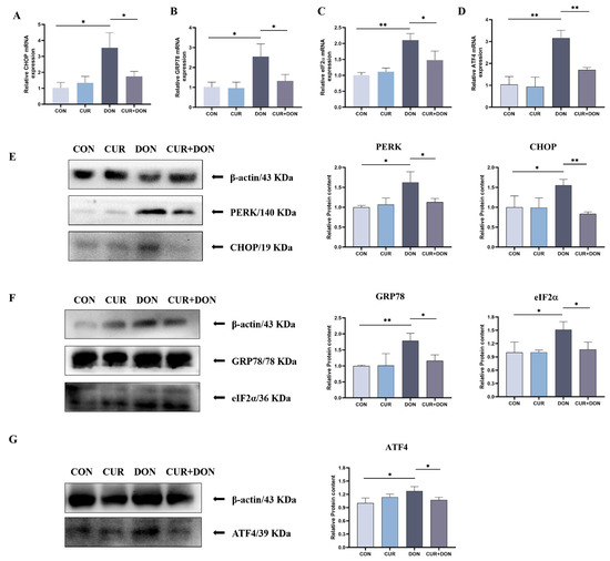 CUR Treatment Reduces DON-Induced ERS through PERK/CHOP Pathways. (A) Relative CHOP mRNA level. (B) Relative GRP78 mRNA level. (C) Relative eIF2α mRNA level. (D) Relative ATF4 mRNA level. (E) Relative protein levels of PERK and CHOP. (F) Relative protein levels of GRP78 and eIF2α. (G) Relative protein levels of ATF4. * p < 0.05, ** p < 0.01, compared to control (CON) and deoxynivalenol (DON).