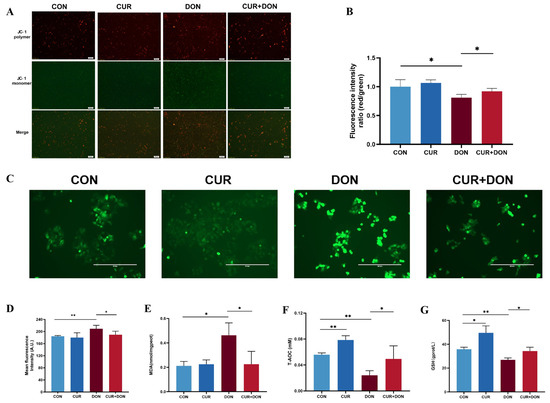 Cytological Validation of CUR to Attenuate DON-induced Oxidative Stress in IPEC-J2 Cells. (A) Inverted fluorescence microscopy of IPEC-J2 cells after JC-1 staining (scale bar represents 200 μm). (B) The different ratios (JC-1 polymer/JC-1 monomer) of JC-1 fluorescence for each group. (C) After incubation with DCFH-DA, cells were washed and examined by fluorescence microscopy (scale bar represents 400 μm). (D) Analysis based on green fluorescence intensity in (C). (E) MDA content in IPEC-J2 cells. (F) T-AOC activity in IPEC-J2 cells. (G) GSH activity in IPEC-J2 cells. * p < 0.05, ** p < 0.01, compared to control (CON) and deoxynivalenol (DON).