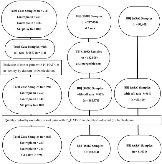 In the second cohort (Figure 1), BBJ (ASA), genome-wide SNP data of 54,405 samples were obtained from NBDC after ethical approval (Identifier: 0026, date of approval: 28 March 2022) by the Institutional Review Board affiliated with Tsukuba International Clinical Pharmacology Clinic (Tsukuba City, Japan) for the use as control. The genotype data were determined by Infinium Asian Screening Array-24 v1.0 BeadChip Kit in 11,716 individuals from BBJ first cohort and 42,689 individuals from BBJ second cohort (Dataset ID JGAS000412, Release Date: 30 November 2021). The controlled access of the dataset was approved as Data in Use ID JGAD000529 (Principal Investigator: Shigeo Kamitsuji, Affiliation: Statistical Analysis Division, Stagen Co., Ltd., Country/Region: Japan, Research Title: Genome-Wide Association Study to identify genetic factors for strabismus in Japanese population, Period of Data Use: 13 February 2023–28 February 2027). Samples with call rate less than 95% were excluded to obtain dataset of 53,409 samples for analysis.