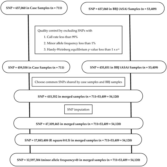 In the case of BBJ (ASA) as control samples, 435,851 of 657,060 SNPs were chosen in 53,409 samples of BBJ (ASA), according to the same standard as described above. Based on the reference panels for Japanese population [51,52], imputation was carried out by a method of pre-phasing imputation with Minimac4 for 415,352 SNPs which were common between the case and the control [58,59,60]. The data of 17,883,408 SNPs were used for genome-wide association study after quality control of 47,109,465 imputed SNPs by imputation quality metric R-square (estimated r2, specific to each SNP) equal to or greater than 0.3. In GWAS, the number of SNPs was 12,597,304 after the final exclusion of 5,286,104 SNPs with minor allele frequency = 0 (Figure 3).
