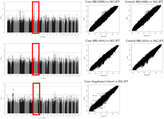 Comparison of SNP dosage after SNP imputation. Note that there is no difference between 1KG JPT in the vertical axis and imputed SNPs in the horizontal axis. SNPs in chromosome 6 (red box) were used as shown in Manhattan plot where red line indicates p = 5 × 10−8 and blue line indicates p = 1 × 10−6. Upper panels: GWAS with BBJ (180K). Middle panels: GWAS with BBJ (ASA). Lower panels: GWAS with Nagahama Cohort. 1KG JPT, Japanese population of 1000 Genomes Project.