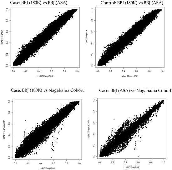 Comparison of SNP dosage after SNP imputation. Note that there is no difference between BBJ (180K) and BBJ (ASA) in the case (top left panel) and the control (top right panel). Furthermore, note that there is no difference between BBJ (180K) and Nagahama Cohort (bottom left panel) and between BBJ (ASA) and Nagahama Cohort (bottom right panel) in the case.