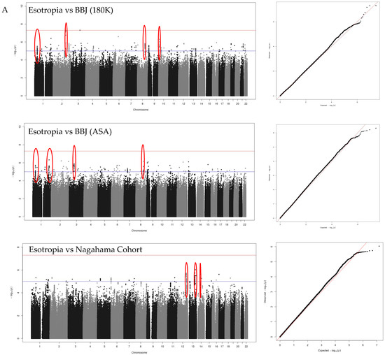 Meaningful peaks (red circles) formed by proximal SNPs in each Manhattan plot with control cohort of BBJ (180K), BBJ (ASA), and Nagahama. Chromosomal location on the horizontal axis versus −log10(p) on the vertical axis of each Manhattan plot. Red line indicates p = 5 × 10−8 and blue line indicates p = 1 × 10−6. Q–Q (log quantile–quantile p-value) plots with expected −log10(p) on the horizontal axis versus observed −log10(p) on the vertical axis, shown next to each Manhattan plot. Red line in each Q–Q plot indicate a correlation line. Only the group of exotropia is suggested to have a structured bias from the Q–Q plots. The case group is esotropia (A), exotropia (B), idiopathic superior oblique muscle palsy (C), comitant strabismus of esotropia and exotropia (D), and all cases of esotropia, exotropia, and idiopathic superior oblique muscle palsy (E).