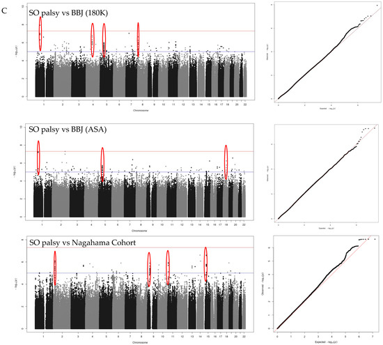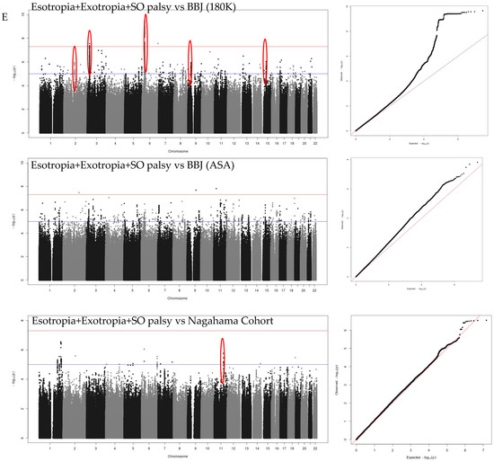 Manhattan plots were drawn with chromosomal location on the horizontal axis and statistical value, −log10(p-value), on the vertical axis for esotropia (Figure 7A), exotropia (Figure 7B), idiopathic superior oblique muscle palsy (Figure 7C), the combination of esotropia and exotropia (Figure 7D), and all entities of esotropia, exotropia, and superior oblique muscle palsy (Figure 7E). In three series of GWASs with three different control cohorts, meaningful peaks with a loose standard of p < 1 × 10−6 formed by the gathering of proximal SNPs in the linkage are indicated by red circles in each plot. Q–Q (log quantile–quantile p-value) plots which were depicted with the expected −log10(p) on the horizontal axis versus the observed −log10(p) on the vertical axis are shown next to each Manhattan plot. Only the group of exotropia was suggested to have a structured bias from the Q–Q plots.