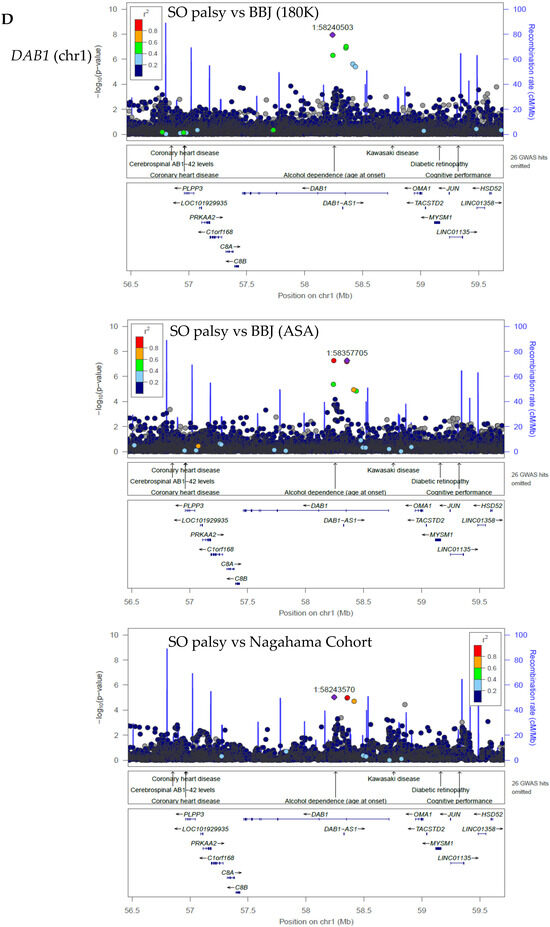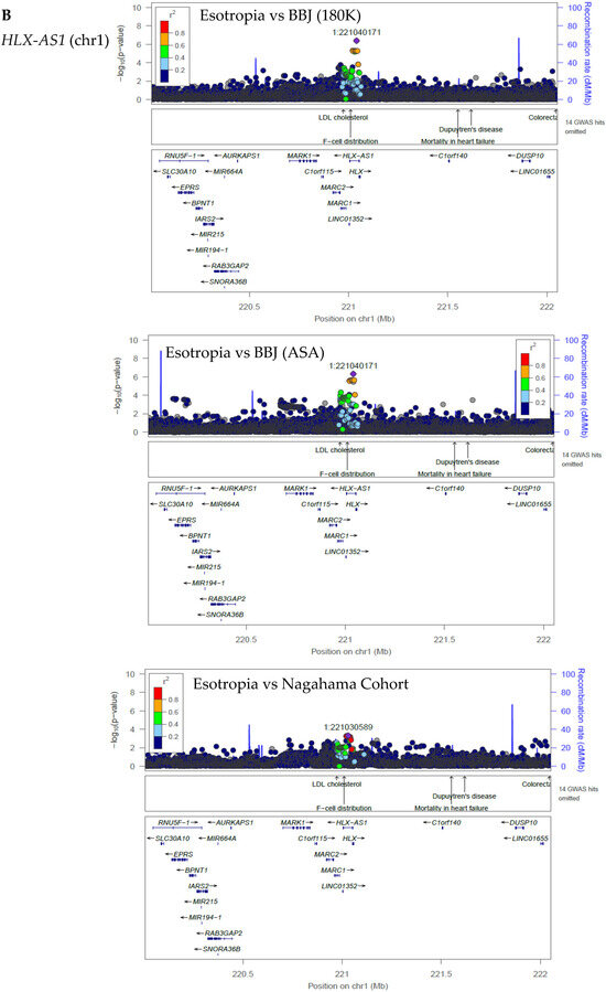 As common peaks in three series of GWASs with three different control cohorts, three loci were suggested for esotropia (SFPQ and HLX-AS1 in chromosome 1, and MIR4471 in chromosome 8 as candidate genes; Figure 8A–C, Table 1) and two loci for idiopathic superior oblique muscle palsy (DAB1 in chromosome 1 and PELO in chromosome 5 as candidate genes; Figure 8D,E, Table 1).