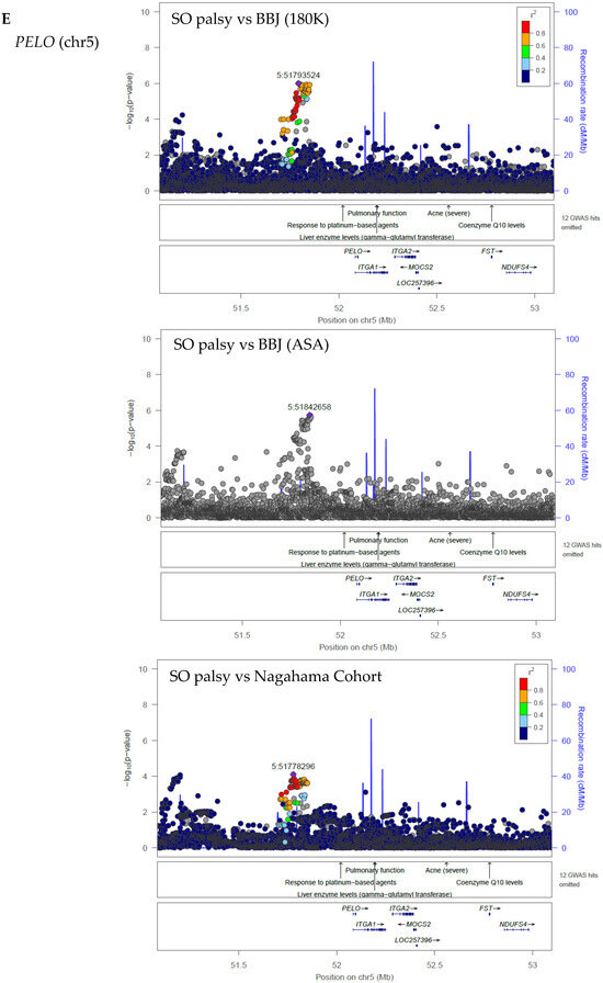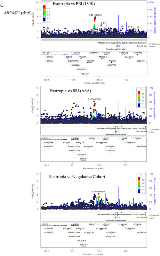 Regional plots by Locus Zoom of common peaks with a loose standard of p < 1 × 10−6 in 3 series of GWASs with 3 different control cohorts of BBJ (180K), BBJ (ASA), and Nagahama Cohort. The case group is esotropia (A–C) and idiopathic superior oblique muscle palsy (D,E).