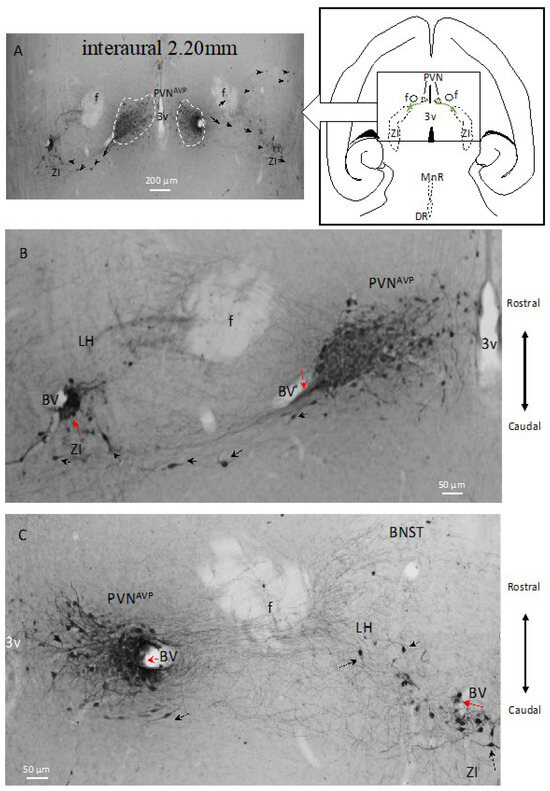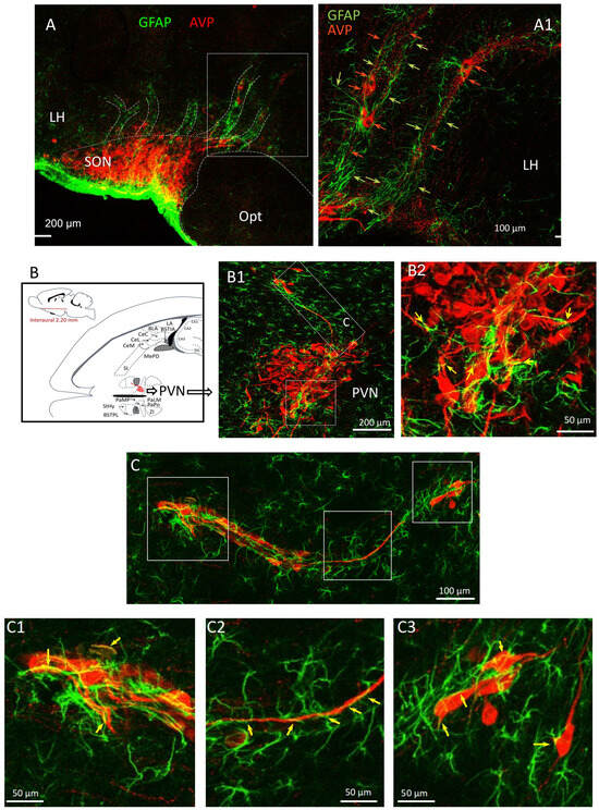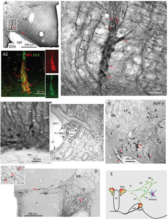 - Zhang, L.; Hernández, V.S.; Murphy, D.; Young, W.S.; Eiden, L.E. Fine chemo-anatomy of hypothalamic magnocellular vasopressinergic system with an emphasis on ascending connections for behavioural adaptation. In Neuroanatomy of Neuroendocrine Systems; Valery Grinevich, Á.D., Ed.; Springer-Nature: Cham, Switzerland, 2021. [Google Scholar]