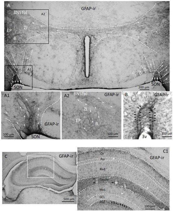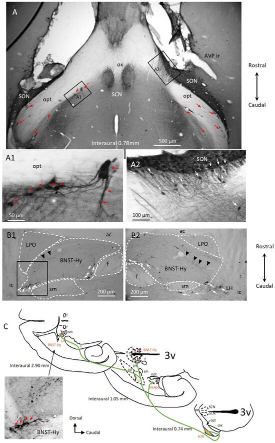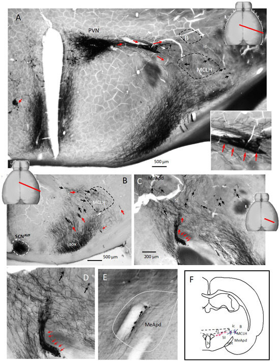 - Hernandez, V.S.; Vazquez-Juarez, E.; Marquez, M.M.; Jauregui-Huerta, F.; Barrio, R.A.; Zhang, L. Extra-neurohypophyseal axonal projections from individual vasopressin-containing magnocellular neurons in rat hypothalamus. Front. Neuroanat. 2015, 9, 130. [Google Scholar] [CrossRef]