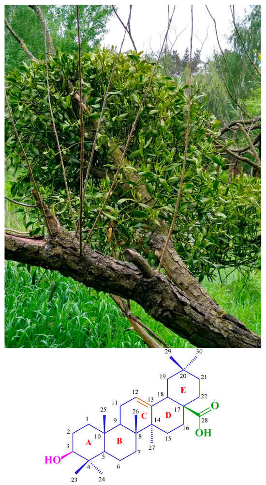 Among natural compounds, flavonoids, alkaloids, and terpenoids are very popular [2]. The last of these, terpenoids, also known as isoprenoids, are substances widely distributed in the plant world. They constitute an extensive group of substances—over 40,000 [3]—divided into several subgroups depending on the molecule’s structure. The largest and most popular group among terpenoids is triterpenes, characterised by skeletons always composed of 30 carbon atoms. Oleanolic acid (Figure 1) represents triterpenes with an oleanane skeleton, occurring in at least 1600 edible and medicinal plants [4]. A rich source of this compound is, among others, mistletoe herb (Viscum alba, Figure 1). Its carbon skeleton consists of five six-membered rings, as shown in Figure 1. There is a hydroxyl group at the C-3 position of the oleanane skeleton, a carboxyl group at the C-17 position, and a double bond between the C-12 and C-13 atoms. The presence of the three mentioned reactive functional groups in the oleanolic acid molecule means that the compound can be subjected to numerous chemical modifications, producing numerous derivatives.