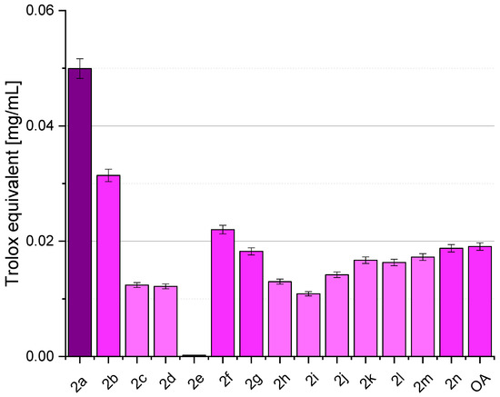 Figure 3 depicts various samples’ DPPH radical-scavenging activity, with OA (oleanolic acid, 1) representing the naturally occurring compound and subsequent entries representing synthesised OADs 2a–2n. The results are presented as % inhibition of the DPPH radical and Trolox equivalent, calculated from the standard curve (Figure 4). Activity assays were performed in eight repetitions.